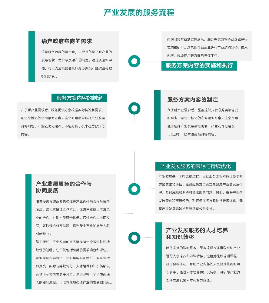 產業發展服務流程SINCERE SERVICE確定政府客商的需求了解產業發展現狀、需求以及潛在的問題,通過調查和評估,為后續的咨詢服務方案、設計提供基社數據和信息。服務方案內容的制定在了解產業需求后,綠天使根據實際況和需求制定個性化的咨詢服務方案。方案通常包括產業發展戰略規劃、產業鏈優化建議、市場分析、技術趨