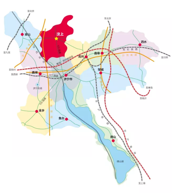 汶上處于京津冀、環渤海、長三角經濟圈的中間地帶,交通發達,物流系統完善,周邊地區是中國經濟最為活躍的區域,擁有最為廣闊的市場空間。目前,汶上已形成快捷便利的立體化交通網絡。汶上東距京滬鐵路兗州站30公里,距京滬高鐵曲阜東站50公里,西距京九鐵路梁山站40公里,南距兗菏鐵路濟寧站35公里。由曲阜高鐵東站乘坐高鐵2小時內可到達北京、天津、青島、南京等城市,3小時到達無錫、蘇州、上海、杭州等城市。日蘭高速、濟廣高速、濟徐高速三條高速公路穿越縣境,有濟徐高速汶上西、汶上南,日東高速濟寧北3個高速出入口,105國道縱貫南北。縣城距濟南機場140公里,距濟寧機場40公里。距青島港350公里,距日照港230公里,距京杭大運河濟寧碼頭40公里、汶上南旺碼頭20公里。