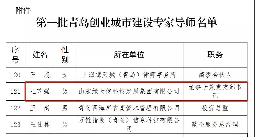 綠天使集團董事長兼黨支部書記王瑞強入選首批青島創業城市建設專家導師名單