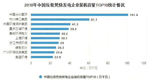 中國(guó)產(chǎn)業(yè)發(fā)展促進(jìn)會(huì)生物質(zhì)能產(chǎn)業(yè)分會(huì)于2019年6月27日發(fā)布的《2019中國(guó)生物質(zhì)發(fā)電產(chǎn)業(yè)排名報(bào)告》顯示,2018年我國(guó)垃圾焚燒發(fā)電前十的企業(yè)分別為光大國(guó)際、錦江集團(tuán)、中國(guó)環(huán)境保護(hù)集團(tuán)、重慶三峰環(huán)境、粵豐環(huán)保電力、上海環(huán)境、偉明環(huán)保、綠色動(dòng)力、廣州環(huán)保投資集團(tuán)、瀚藍(lán)環(huán)境。從裝機(jī)容量、垃圾處理量、發(fā)電量以及年上網(wǎng)電量來(lái)看,光大國(guó)際垃圾發(fā)電均遙遙領(lǐng)先,斷層優(yōu)勢(shì)明顯。