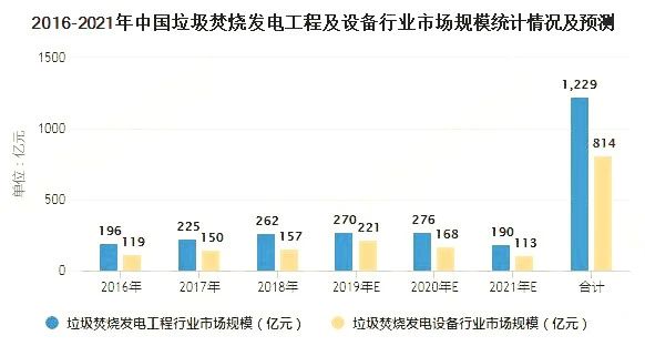 根據(jù)對(duì)光大國(guó)際、海螺創(chuàng)業(yè)、上海環(huán)境、偉明環(huán)保、綠色動(dòng)力等12家垃圾發(fā)電上市公司運(yùn)營(yíng)項(xiàng)目投資額的測(cè)算,得到2016-2019年垃圾發(fā)電項(xiàng)目單位投資成本由54萬(wàn)元/(噸/日)提高至55萬(wàn)元/(噸/日),假設(shè)2020年單位投資成本小幅提升至56萬(wàn)元/(噸/日);考慮典型的垃圾發(fā)電項(xiàng)目投資結(jié)構(gòu),工程土建、工程安裝、設(shè)備以及其他分別占比25%、13%、38%、24%,同時(shí)假設(shè)垃圾焚燒發(fā)電項(xiàng)目建設(shè)周期為18個(gè)月,T年投運(yùn)的項(xiàng)目在T-2/T-1/T年的建設(shè)期分別為2.5/10/5.5個(gè)月,則2026-2021年間垃圾發(fā)電總工程及設(shè)備市場(chǎng)規(guī)模分別達(dá)到1229億元和814億元。