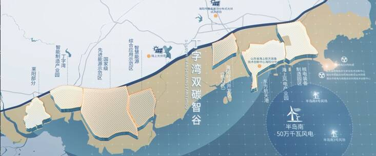 丁字灣“雙碳”智谷位于膠東半島南端,西臨青島、東接威海,北至威青高速沿線,區域規劃面積約450平方公里,涉及9個鎮街區,包括1個國家級旅游度假區、1個省級經濟開發區和1個省級核電裝備制造工業園區。該項目作為煙臺市“一谷一區一島一港”的重要組成部分,融合了核電、風電、航空航天、智能制造等多類產業項目,未來這里將打造成膠東經濟圈融合發展先行區和中日韓新能源合作先導區。