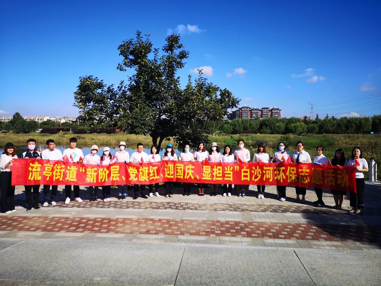 宣講活動結束后,園區企業代表前往白沙河河畔,參加白沙河環保志愿活動。在活動中,大家既為街道的環保工作貢獻了力量,同時放松身心、舒緩壓力、增進溝通交流,用實際行動為國慶節的到來增光添彩。企業代表們紛紛表示,作為新的社會階層人士,要有更高的政治站位,更大的責任擔當,共同努力參與社會治理共同體,為完善共建共享共治的社會治理制度建言獻策,為構建社會治理共同體凝心聚力,為實現社會領域的“中國之治”貢獻智慧。隨后企業代表們一起合影留念。