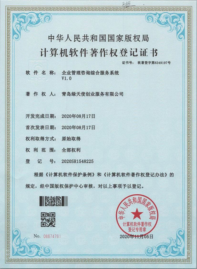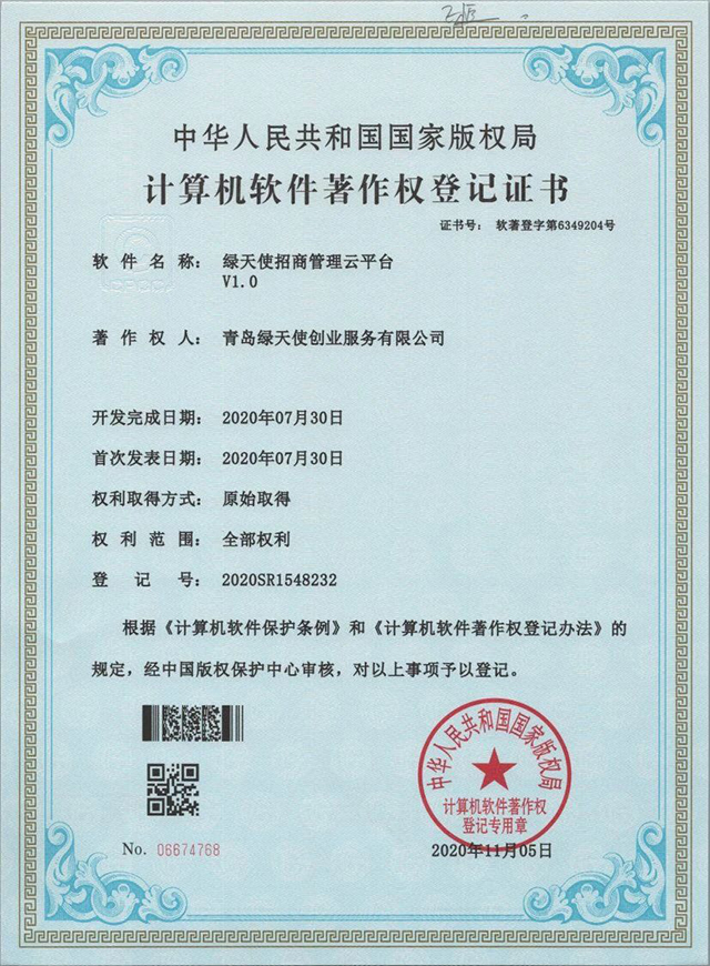 近日,綠天使自主設(shè)計與研發(fā)的三款軟件產(chǎn)品——“企業(yè)管理咨詢綜合服務(wù)系統(tǒng)”、“綠天使招商管理云平臺V1.0”、“企業(yè)孵化器運營服務(wù)平臺V1.0”——獲得國家版權(quán)局計算機軟件著作權(quán)登記證書。