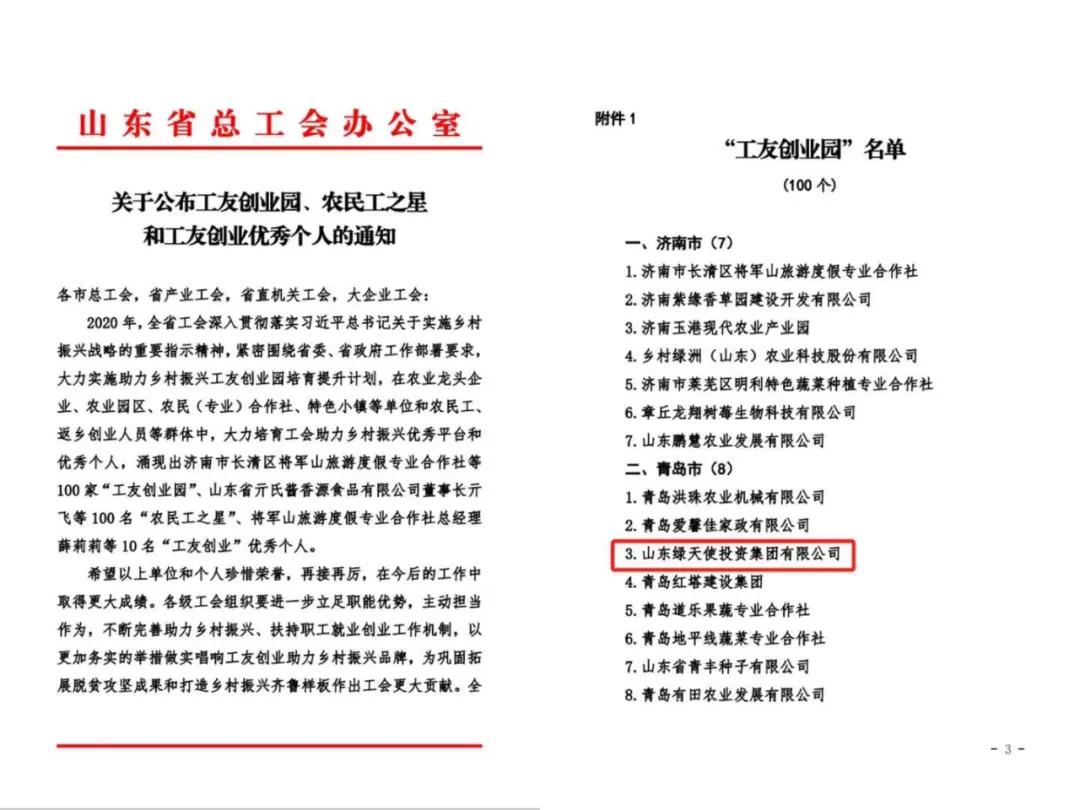 近日,山東省總工會表彰一批“工友創業園”,山東綠天使投資集團有限公司榜上有名,獲得“山東省工友創業園”榮譽稱號。
