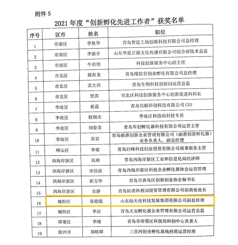 近日,青島市科技企業(yè)孵化器協(xié)會(huì)公示了2021年度青島市創(chuàng)新孵化先進(jìn)評(píng)選結(jié)果,綠天使獲多項(xiàng)殊榮,其中:綠天使環(huán)保創(chuàng)業(yè)園榮獲“創(chuàng)新孵化先進(jìn)機(jī)構(gòu)”獎(jiǎng),山東綠天使科技發(fā)展集團(tuán)有限公司董事長(zhǎng)王瑞強(qiáng)榮獲“創(chuàng)新孵化年度人物”獎(jiǎng),副總經(jīng)理陳聰聰榮獲“創(chuàng)新孵化先進(jìn)工作者”獎(jiǎng)。