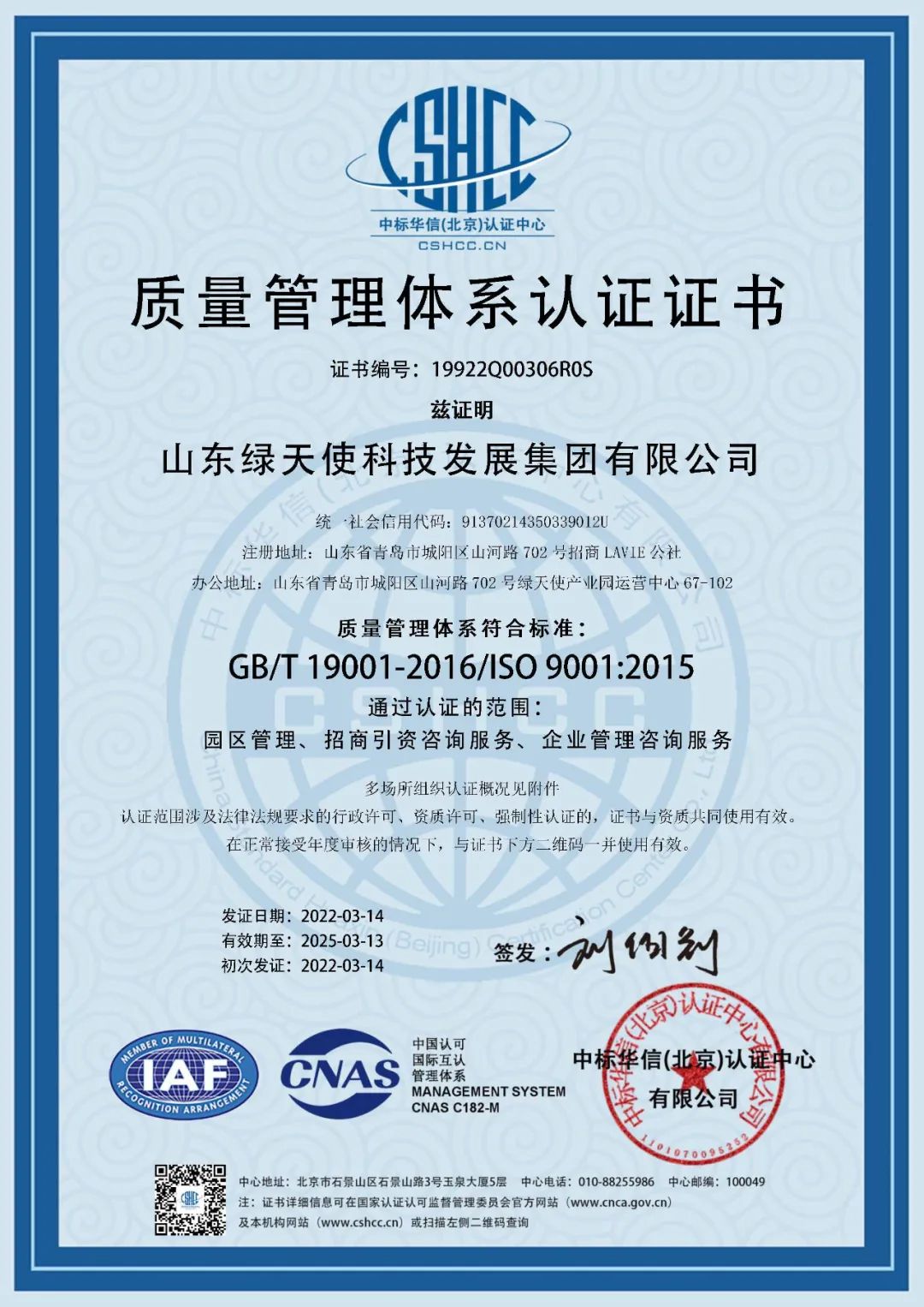 為建立健全的質量管理體系,不斷完善管理機制,進一步提高服務質量,打造園區管理、招商引資服務及企業服務等規范化服務體系。近日,綠天使集團按照ISO9001質量管理體系標準進行了系統化規范化服務體系的提升并順利通過認證,榮獲認證證書。
