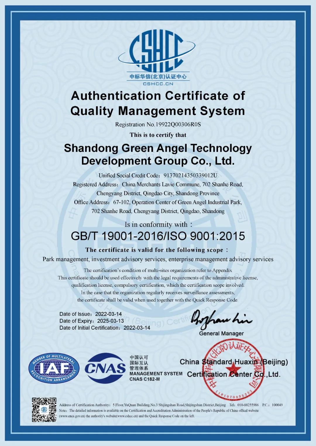 綠天使集團通過ISO9001質量管理體系認證,旨在打造園區管理、招商引資咨詢服務、企業管理咨詢服務規范化、體系化的服務標準,更好的為各級政府、園區企業提供標準化、規范化的服務,有效促進企業資源優化和合理利用的同時,提高企業管理整體水平及市場競爭能力。