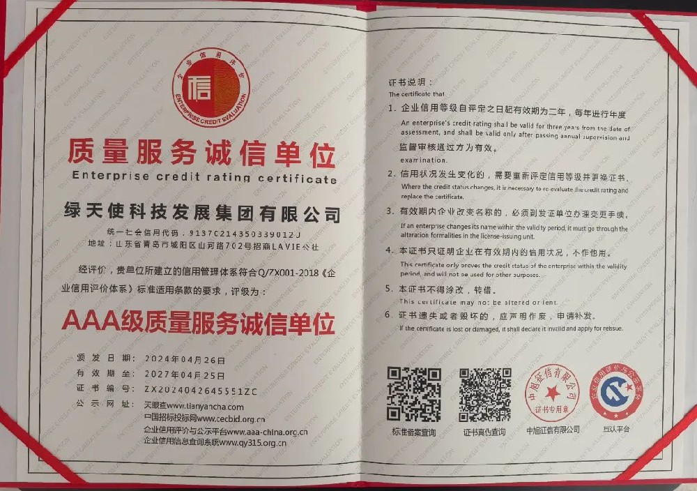 AAA級質量服務誠信單位綠天使集團近日,綠天使集團以其卓越的項目管理實踐、客戶服務承諾及市場信譽,榮獲了“質量服務AAA級誠信單位”榮譽,這一榮譽的獲得,充分體現了綠天使在項目質量管理和產業服務方面的卓越表現,也標志著綠天使在誠信經營領域樹立了業界的新標桿。