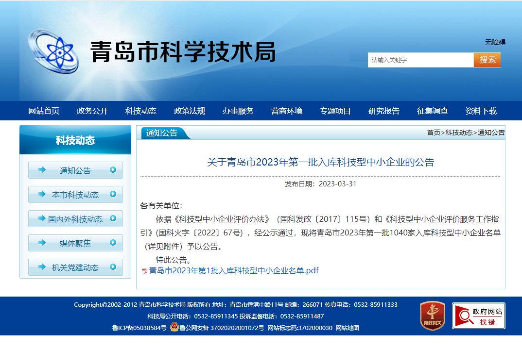 近日,青島市2023年第一批入庫科技型中小企業(yè)名單發(fā)布,山東綠天使科技發(fā)展集團(tuán)有限公司、青島綠天使信息科技有限公司、山東綠天使智慧科技創(chuàng)新園有限公司入庫科技型中小企業(yè)。