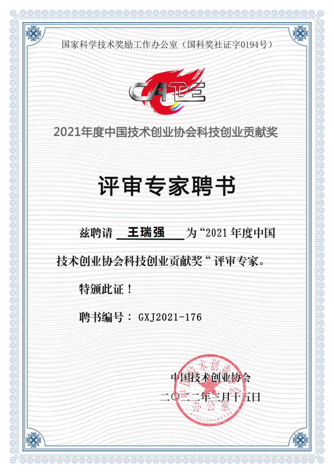 為全面貫徹習近平新時代中國特色社會主義思想,深入落實黨中央、國務院關于科技創新創業的決策部署,宣傳優秀企業科技創新創業典范,發揮其引領帶動作用,近日,中國技術創業協會開展了“2021年科技創業貢獻獎”評選獎勵活動。在此次評選中,綠天使董事長王瑞強被聘為“2021年度中國科學技術創業協會科技創業貢獻獎”評審專家。