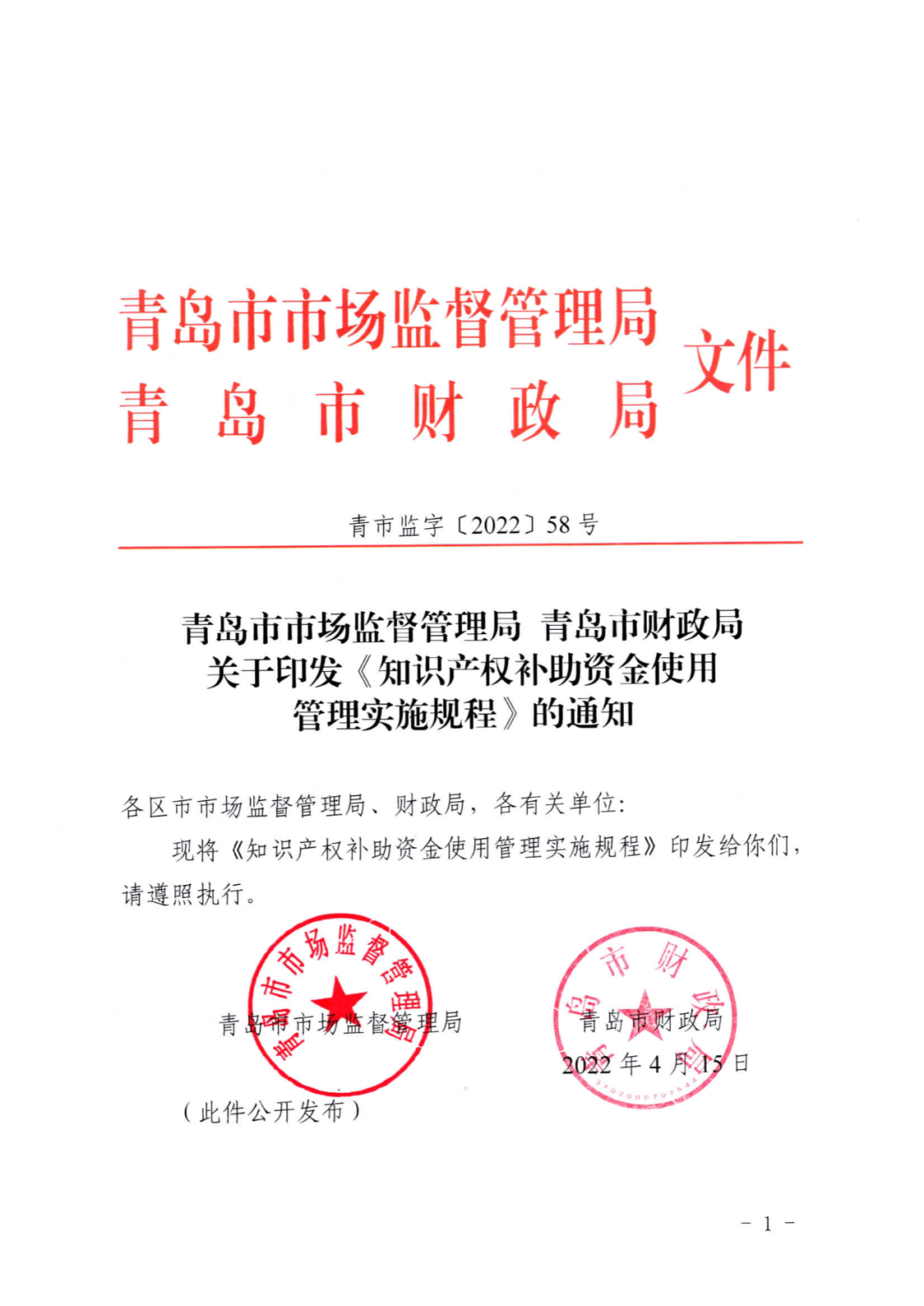 政策快訊 | 青島市市場(chǎng)監(jiān)督管理局 青島市財(cái)政局關(guān)于印發(fā)《知識(shí)產(chǎn)權(quán)補(bǔ)助資金使用管理實(shí)施規(guī)程》的通知